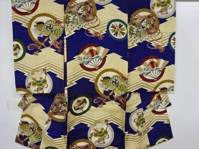 軍配に鉞・文箱・神楽鈴模様男児着物【アンティーク】【中古】