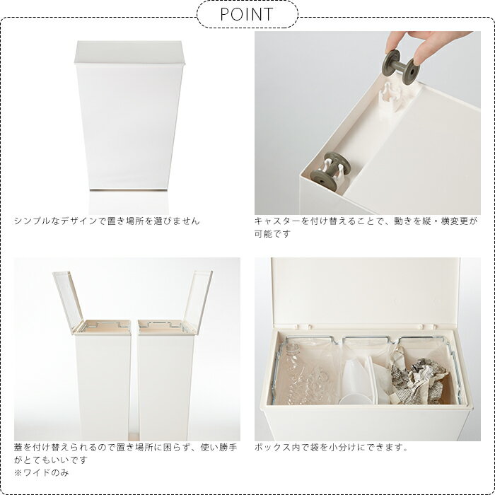 ・キャスターの向きを変えられます・大容量の46Lゴミ袋がぴったり・ごみの分別を3分別可能・フタの開き方が違う2種類これひとつで家族みんなの洗濯物を入れておくことができます。