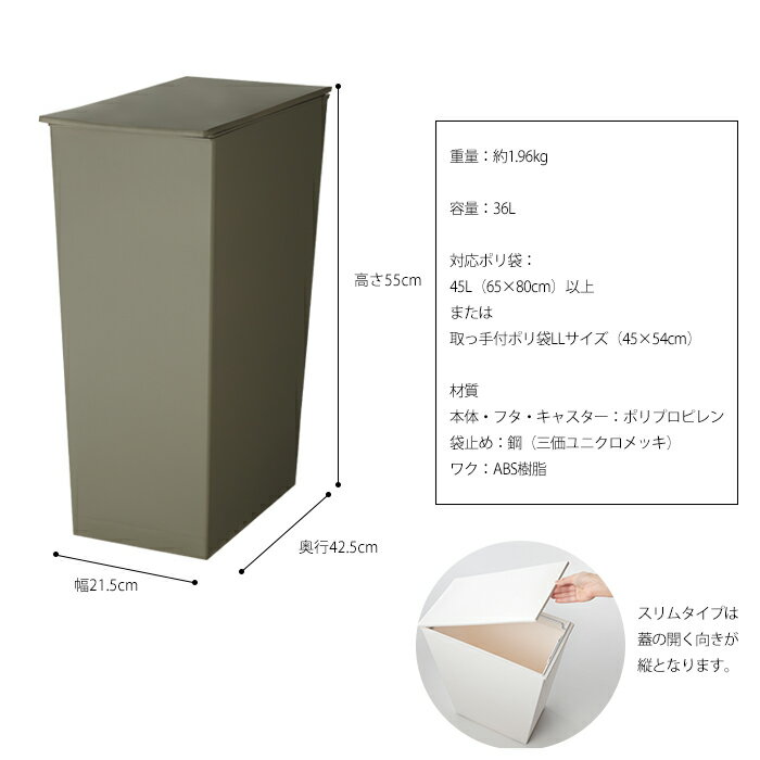 サイズ 幅21.5×奥行42.5×高さ55cm:1.96kg 素 材 本体・フタ・キャスター:ポリプロピレン袋止め:鋼(三価ユニクロメッキ)ワク:ABS樹脂 仕 様 ホワイト・グレー・ブラック 製造国 中国製 備考 容量:36L 北海道・沖縄・離島は別途送料を頂戴いたします。
